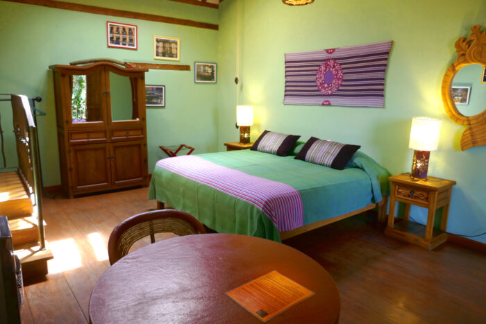 El desayuno puede ser servido en la sala con su enorme viga de madera, en las galerías, en los pasillos o en el patio, cerca del árbol de aguacate. No faltan flores, plantas, y música de fondo de diferentes partes del mundo.